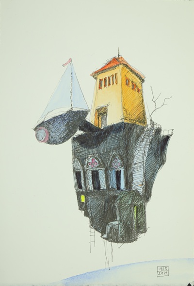 In the evening at the end of my day, I allow myself to relax before sleep. My mind wanders and leads me to other worlds. In a state of mind like a dream, an idea for an image emerges. Sometimes it’s an image I have never seen before, this brings excitement as it takes my imagination to a new place, somewhere different. Often drawn slowly, sometimes fast, I don’t know a direction or reason but being involved with the process leads me to discovery and brings joy. I never aim to censor what comes, just allow it to arrive on paper.