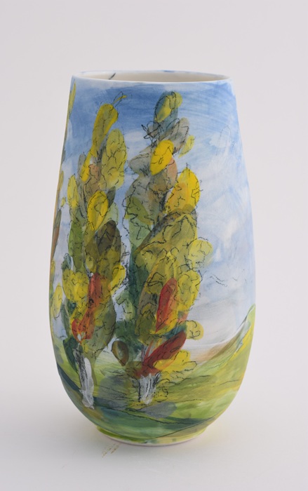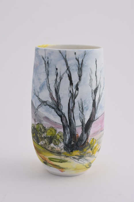 These paintings formed the resources for further development upon her return to her home studio in Mansfield, Victoria, where she created larger canvasses in gouache and acrylic and porcelain vessels, decorated with the stunning landscapes of these National Parks.
